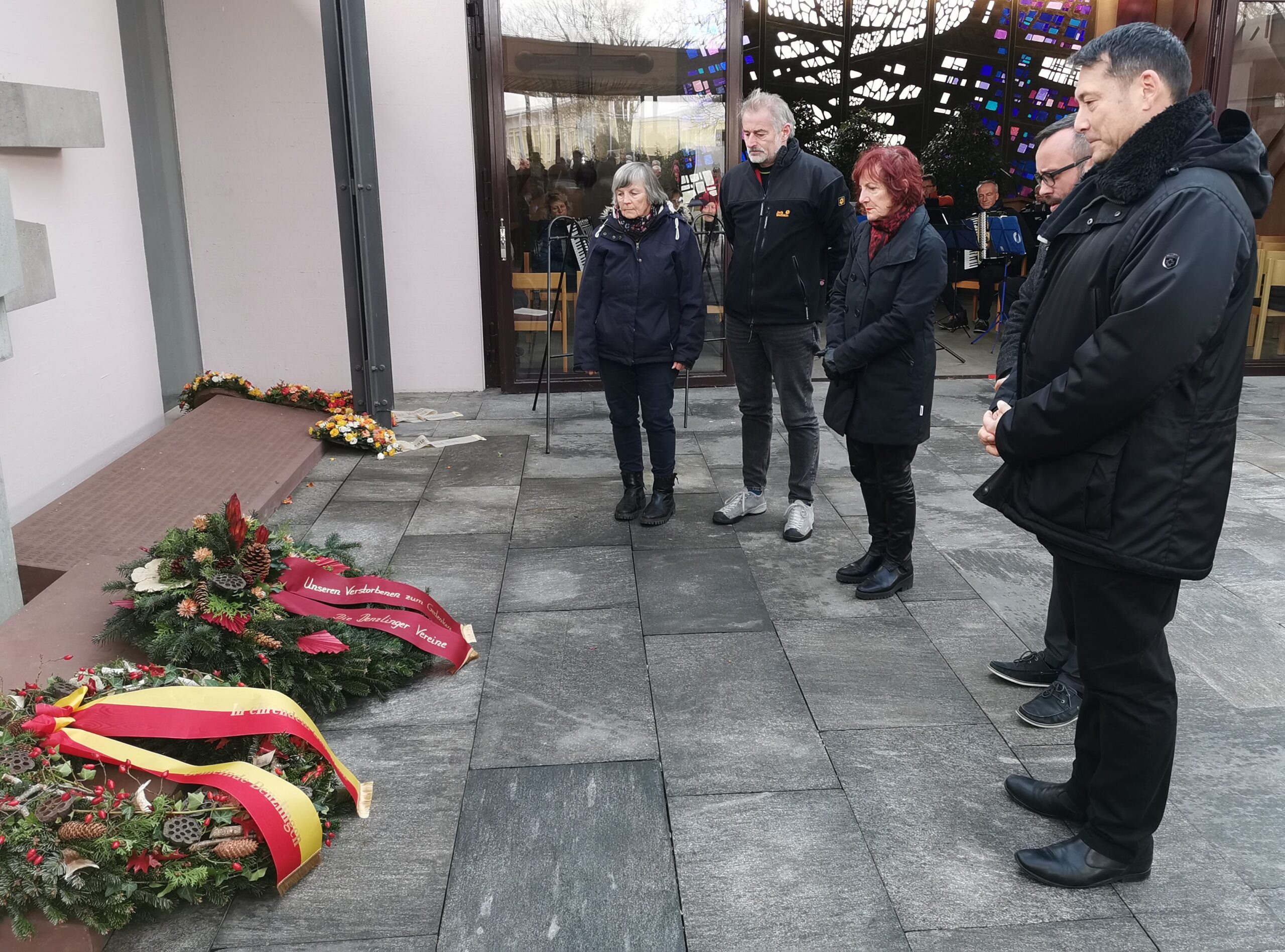 26.11.2023; In stillem Gedenken nach der gemeinsamen Krankniederlegung (v.l.) Elfriede Behnke (Vorsitzende VdK-Ortsverband Denzlingen), Matthias Schubien (Vorsitzender Sportarbeitskreis Denzlingen), Pfarrer Nelson Ribeiro, Bürgermeister Markus Hollemann