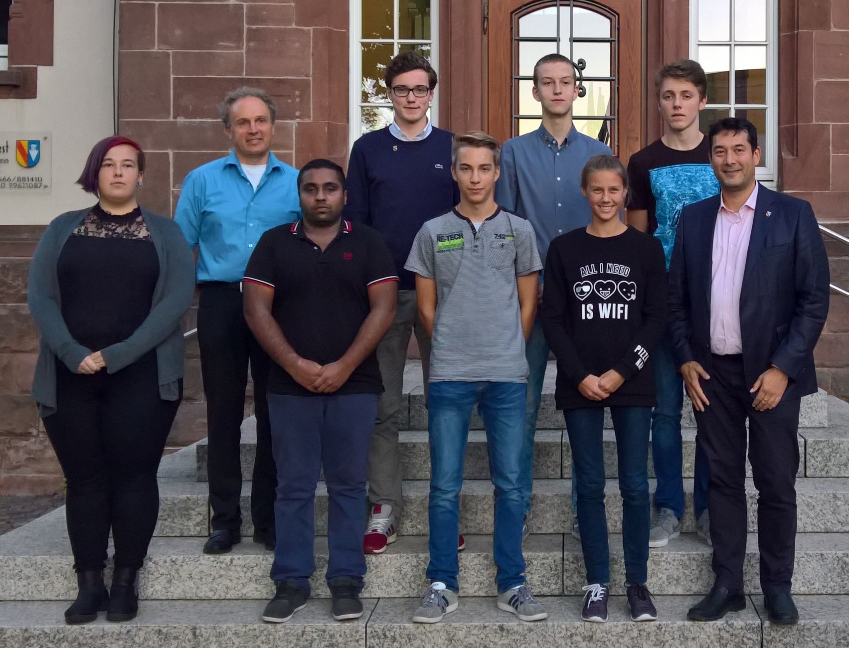 11. Oktober 2017, Verpflichtung der neu gewählten Jugendgemeinderäte, v.l.n.r. Annalena Dietz, Abinath Abayakumaran, Tobias Schlegel, Ines Weniger, Markus Hollemann (Bürgermeister) -vorne, Frank Adler (Jugendpfleger), Benedikt Falk, Lukas Senn, Arne Schmidt, -hinten, Foto Gemeinde Denzlingen, auf dem Foto fehlen: Alisa Herrmann, Elena Kölblin, Sophie Fehrenbach