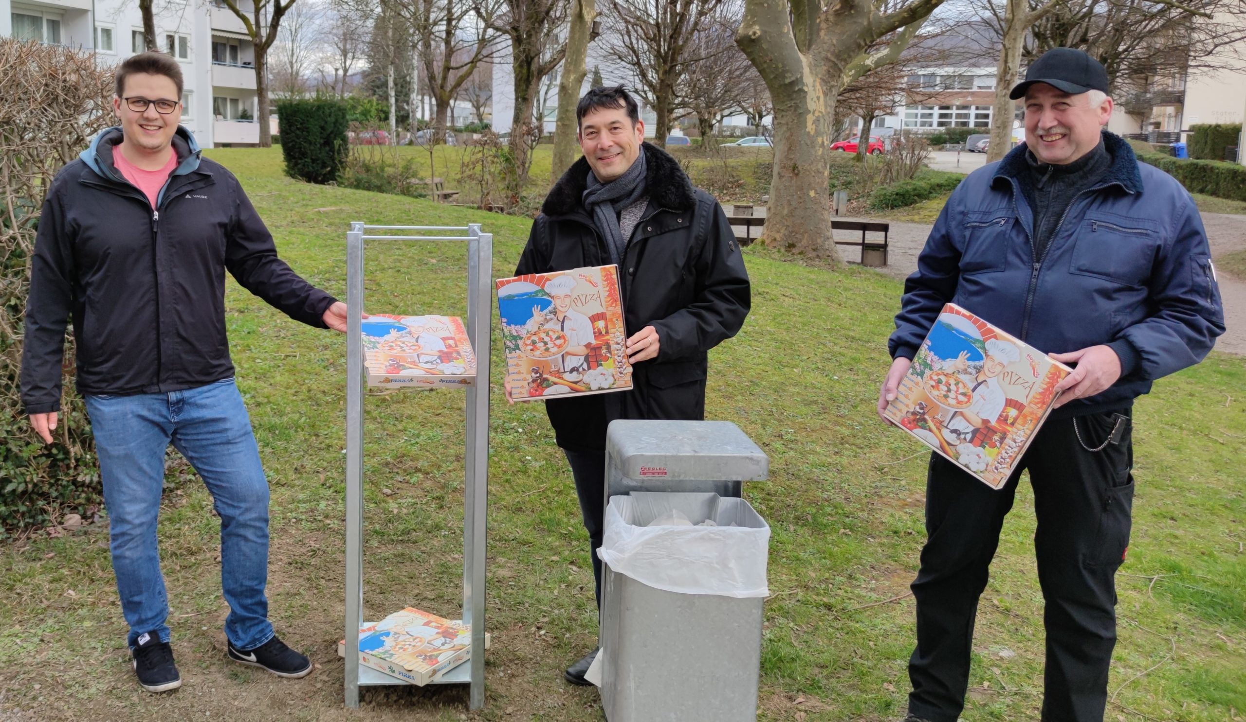 Sammelständer für leere Pizzakartons Stuttgarter Straße, v.l.n.r. Gemeinderat Daniel Mannhardt, Bürgermeister Markus Hollemann, technischer Bauhofleiter Heinz Jund