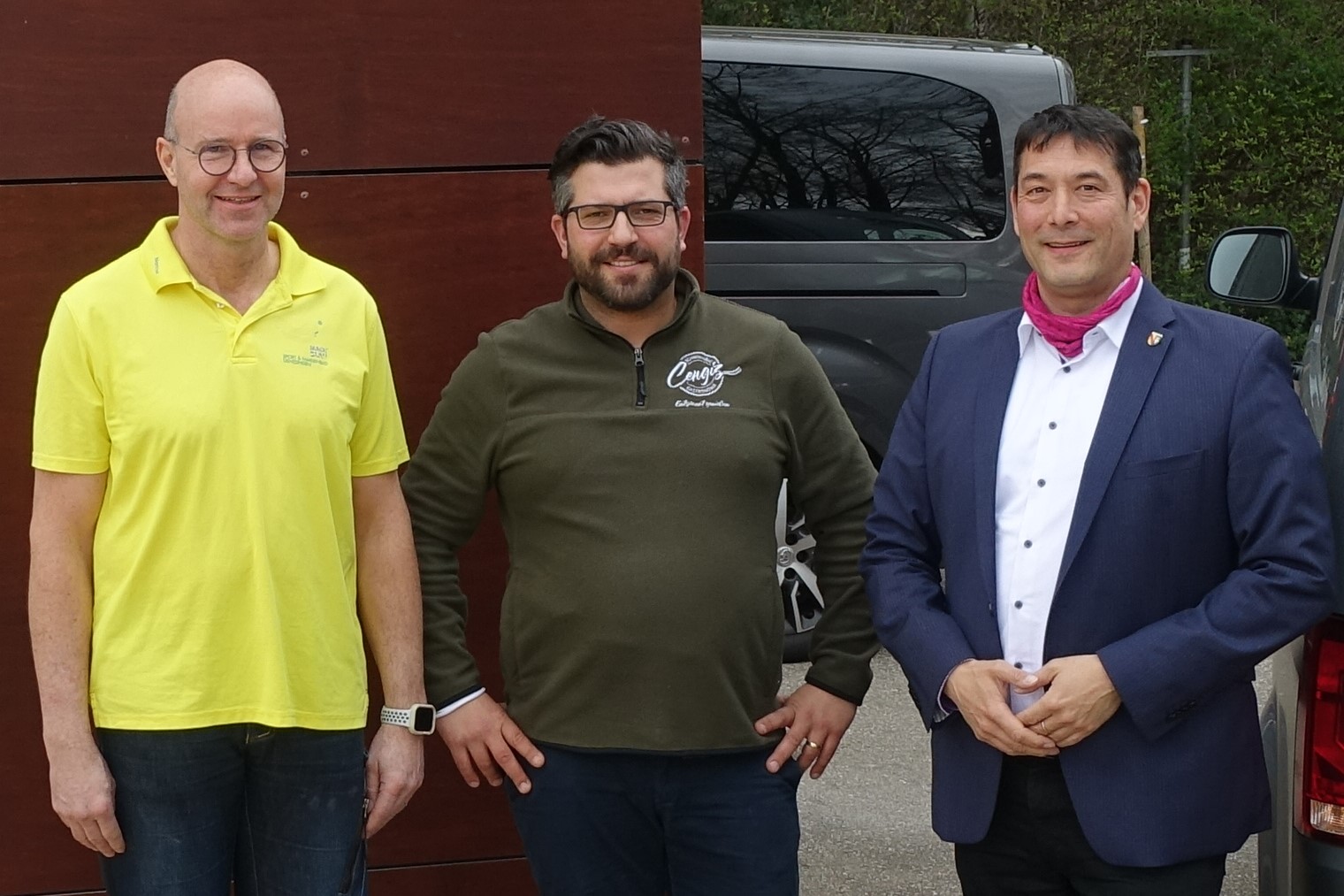 2023-03-31 Cengiz Schwimmbadgastronomie bewirtet Badegäste im MACH BLAU vlnr Marcus Kleint, Bora Cengiz, BM Markus Hollemann 2