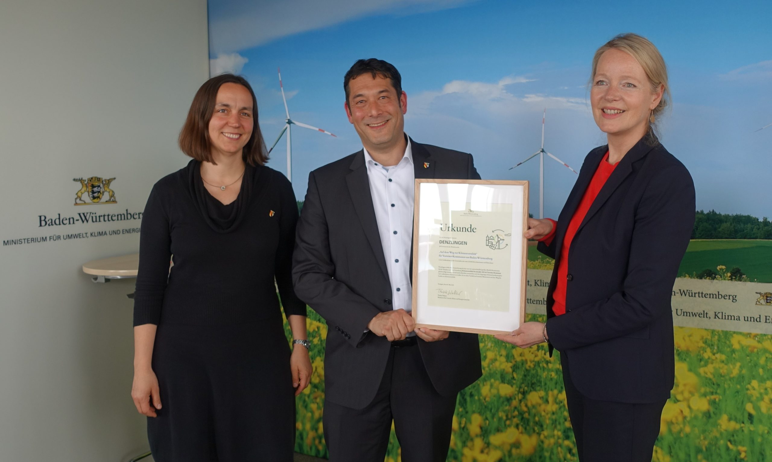 Umweltministerin Thekla Walker, MdL (rechts) überreicht im Umweltministerium in Stuttgart die Siegerurkunde des Landeswettbewerbs „Auf dem Weg zur Klimaneutralität“ für Vorreiter-Kommunen aus Baden-Württemberg an den Denzlinger Bürgermeister Markus Hollemann (Mitte) und Denzlingens Klimaschutzmanagerin Diana Sträuber (links).