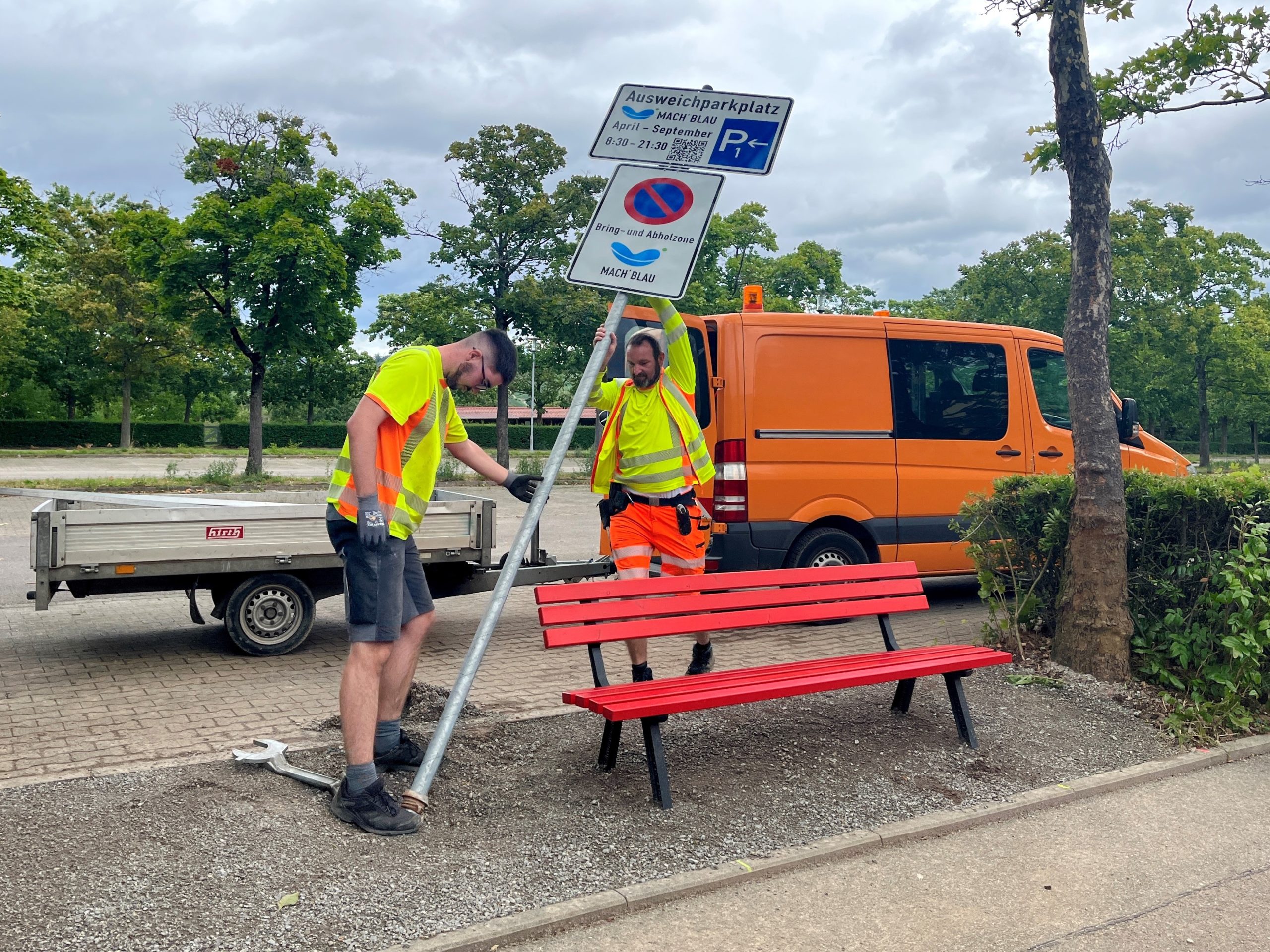 2023-08-07 Neues Wartebänkle am MACH‘ BLAU – Stefan Schill (links) und Matthias Nübling beim Errichten der Beschilderung – Foto Katharina Schrader Gemeinde Denzlingen