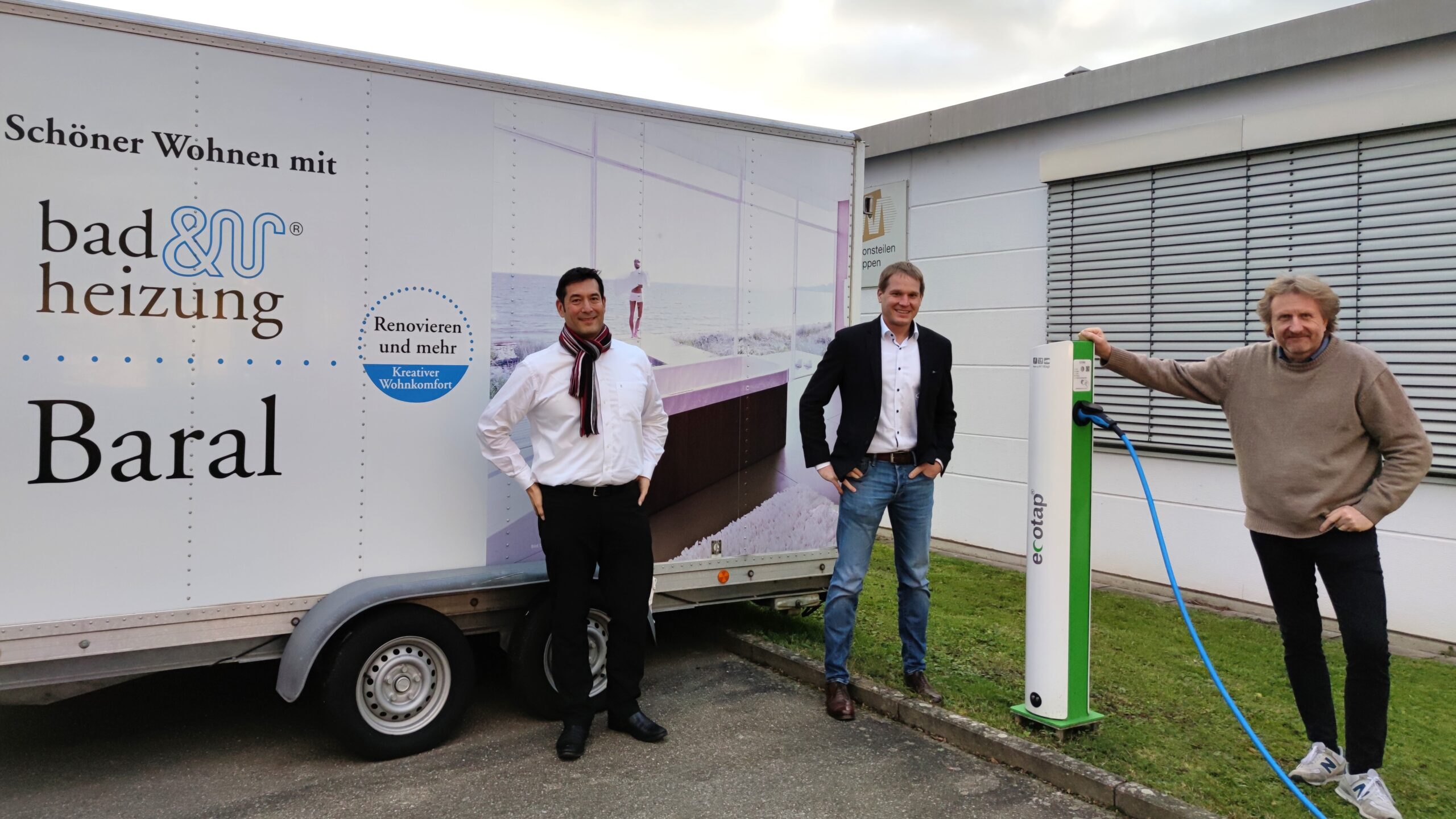 Geschäftsführer Tim Baral (Mitte) führt Bürgermeister Markus Hollemann (links) und Heinz Kury, Geschäftsführer StromSpeicherMarkt GmbH, über das Anwesen der Firma Baral Bad&Heizung im Gewerbegebiet Denzlingen. Foto: Gemeinde Denzlingen