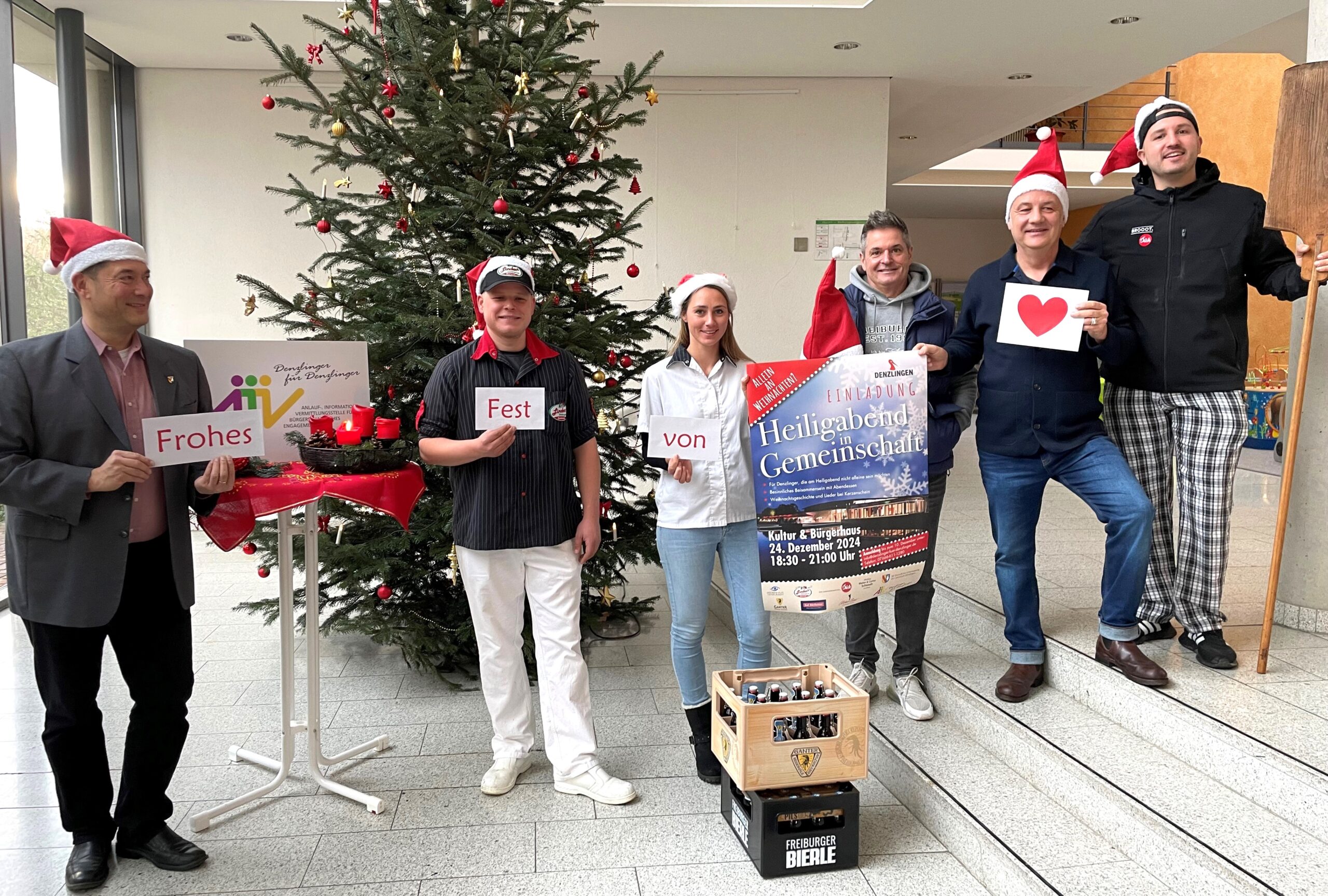 Initiator und Sponsoren trafen sich im Denzlinger Rathaus. Von links: Bürgermeister Markus Hollemann, Nicolai und Sarah Linder (Metzgerei Linder), Thomas Völker (Brauerei Ganter), Oliver Scheffler (Bad Dürrheimer Mineralbrunnen) und Christian Dick (Bäckerei Dick). Es fehlen: Vertreter des Medienhauses Denzlingen, der Glottertäler Winzergenossenschaft Roter Bur und Obstbau Walter & Conny Schwaab. Foto: Ina Huber, Gemeinde Denzlingen