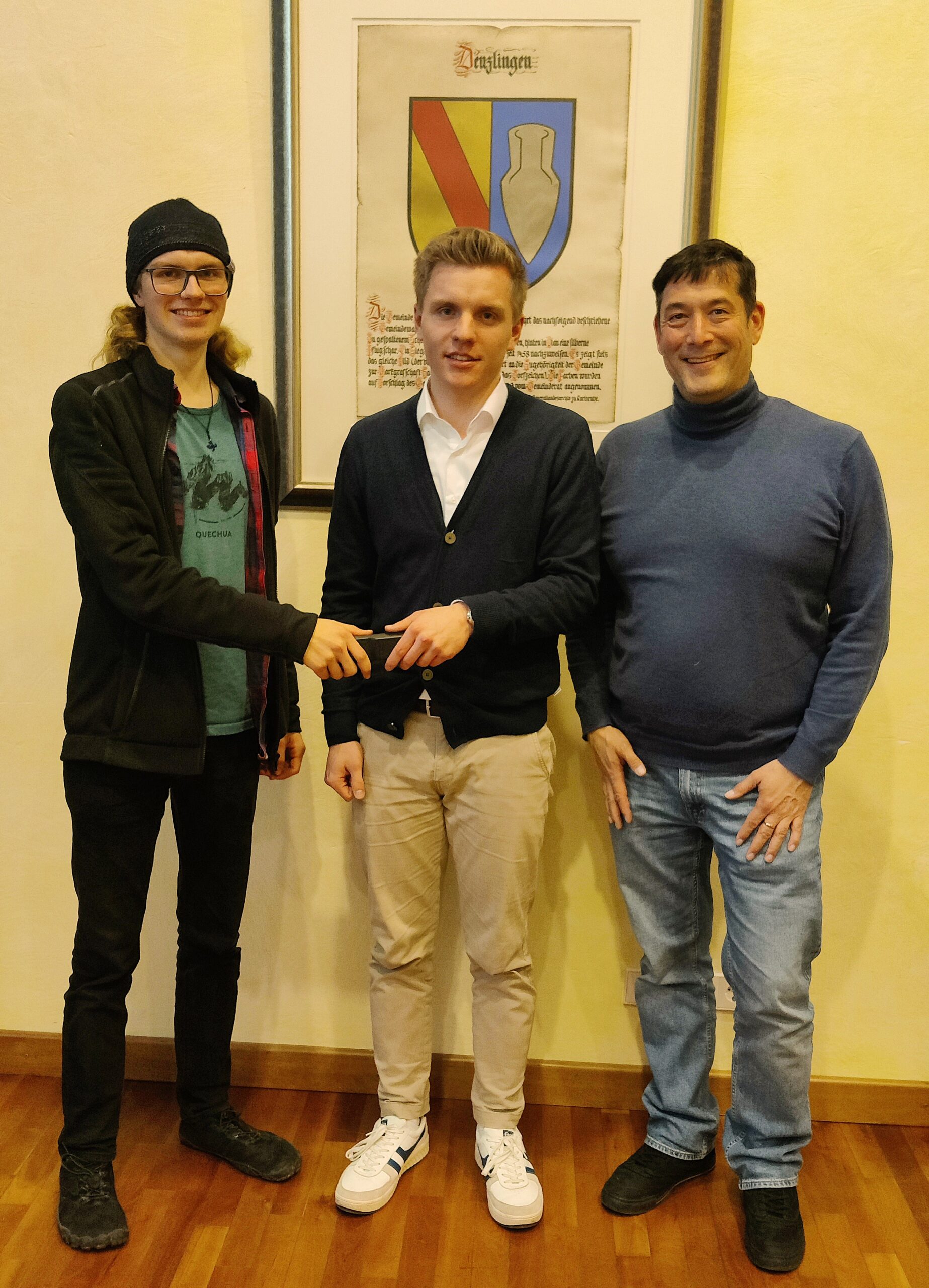 Jakob Kandziorra (Mitte) überreicht unter Beisein von Bürgermeister Markus Hollemann (r.) die symbolische Staffel für das Amt als Sprecher des Denzlinger Jugendgemeinderates an den neuen Amtsinhaber Aaron Höldin (l.). Foto: Jugendpflege Denzlingen.