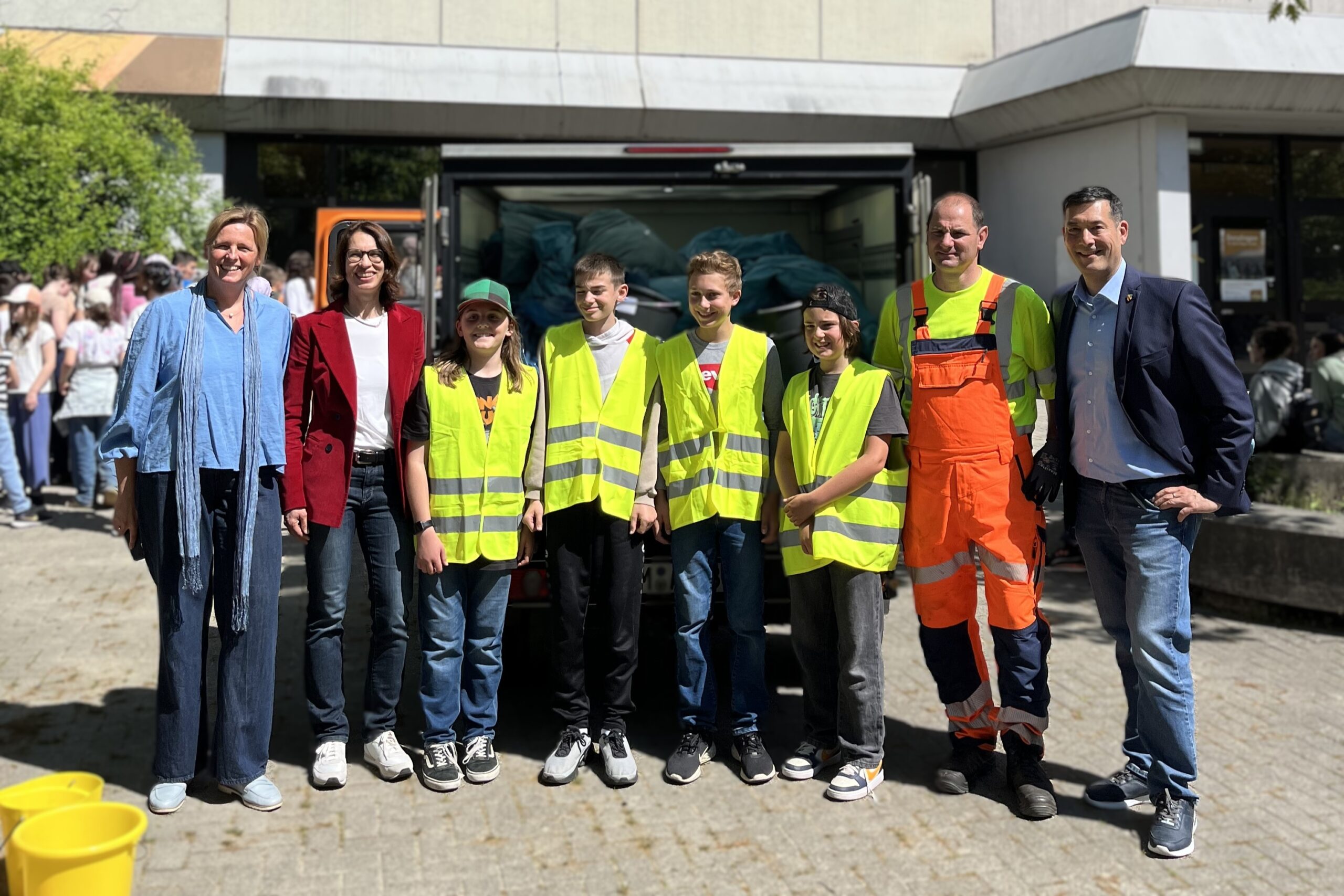 Mit strahlenden Gesichter gratulieren die Rektorin der Denzlinger Grundschule Silke Siegmund (links), Schulleiterin Evelyn Heeg (zweite v. links), Bauhofmitarbeiter Frank Schwehr (zweiter v. rechts) und Bürgermeister Markus Hollemann (rechts) den engagierten Schülern der Ruth-Cohn-Schule Nikola Gatanc, Max Rist, Mika Baumgartner und Justus Wössner(Mitte) zum erfolgreichen Worldcleanupday. Foto: Gemeinde Denzlingen
