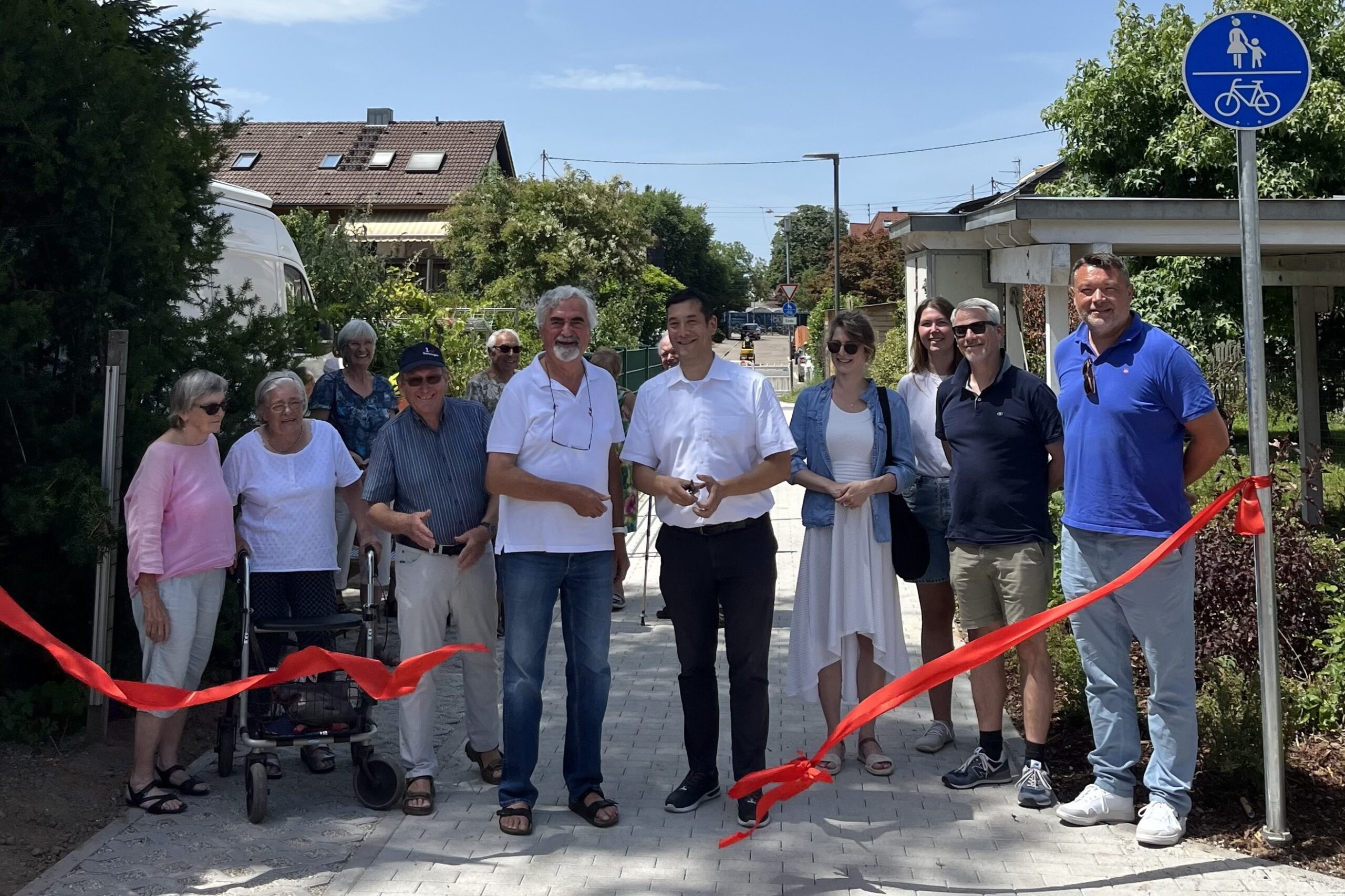 Zur Eröffnung der „Pulsader zum Herzen Denzlingens“, des neuen Fuß- und Radweges zwischen Bahnhof und Ortskern, durchschnitt Bürgermeister Markus Hollemann (5. v. r.) feierlich das symbolische rote Band. Es feierten u.a. mit (v. l. vorne) Gemeinderätin Elfriede Behnke, Anwohnerin Rosa Brunner, Gemeinderat Willi Kieninger, Anwohner Rainer Wacker sowie (v. r.) Tomislav Maras (Weiß Beratende Ingenieure GmbH), Sascha Hoffmann (Gemeinde Denzlingen, Ltg. Tiefbau), Christiane Leonhardt (Weiß Beratende Ingenieure GmbH) und Lisa Brandenburg (Gemeinde Denzlingen, Ltg. Verbandsbauamt). Foto: Fabienne Sauter, Gemeinde Denzlingen.