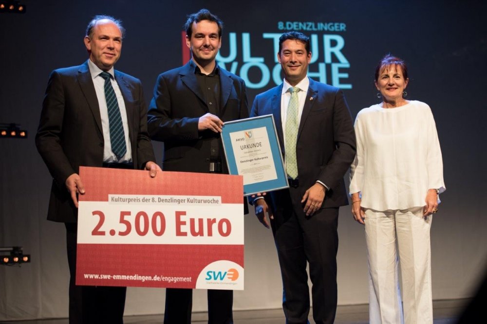 15. Oktober 2017, Verleihung Denzlinger Kulturpreis 2017, v.l.n.r.: Thomas Schneider (Stadtwerke Emmendingen/Sponsor), Sebastian Anders (Denzlinger Kulturpreisträger 2017), Markus Hollemann (Bürgermeister/Schirmherr), Petronella Rußer-Grüning (AKVD Vorsitzende), Foto: Ellen Schmaus