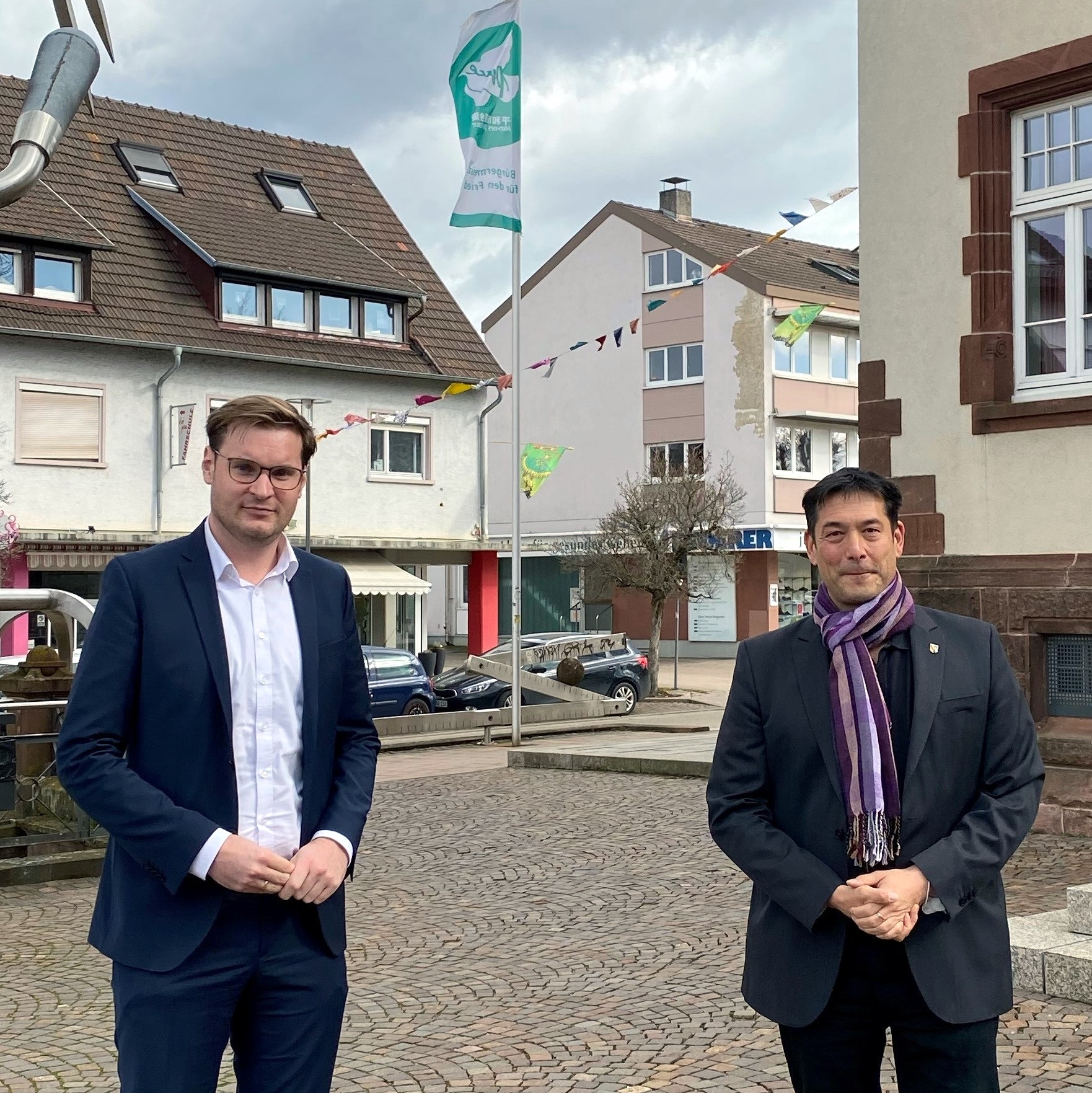 CDU-MdB Yannick Bury und BM Markus Hollemann vor der Mayors for Peace Fahne beim Alten Rathaus in Denzlingen