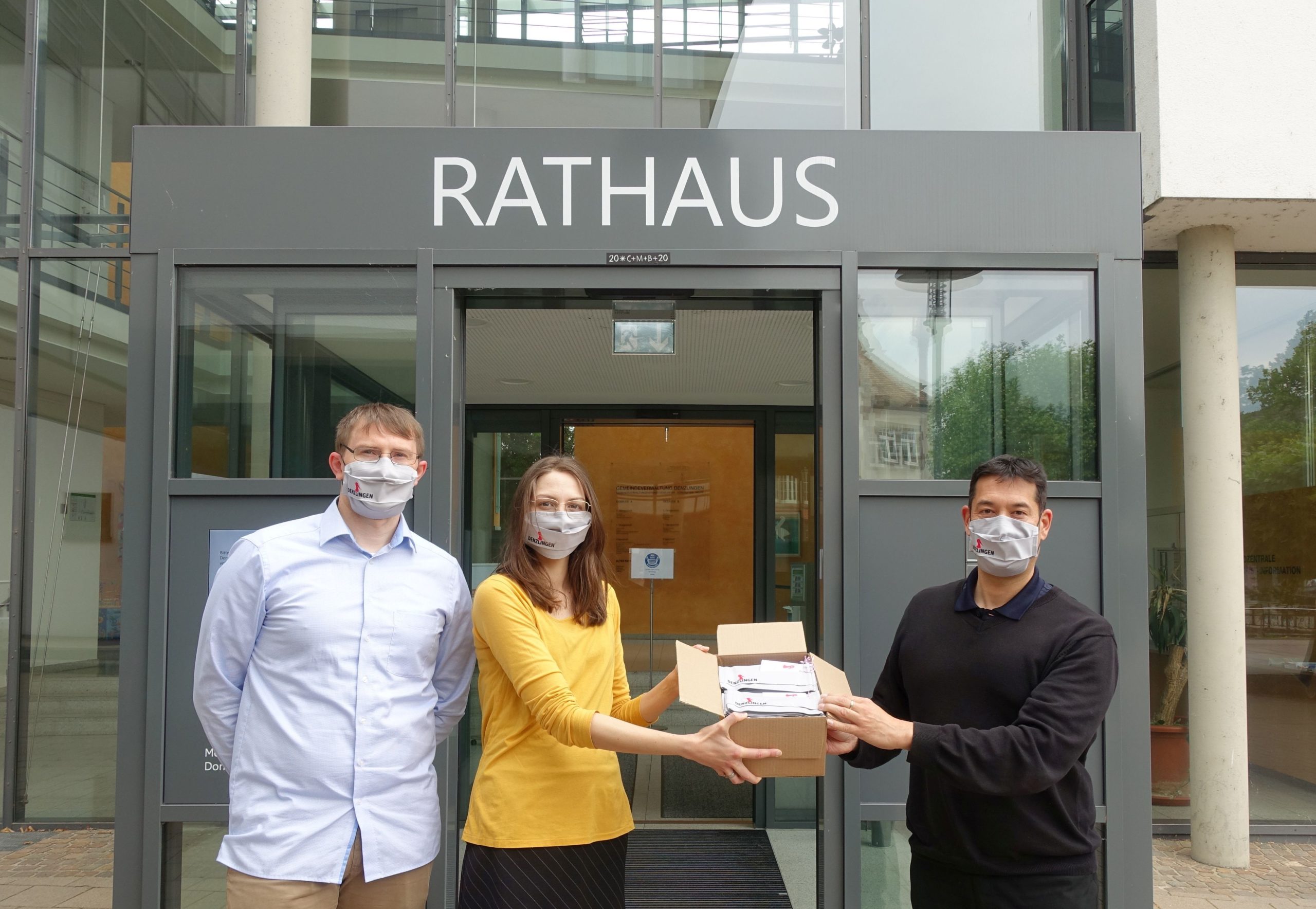Das Ehepaar Sabrina und Ralph Maldet übergibt Bürgermeister Markus Hollemann die neuen „Denzlingen“-Alltagsmasken, Foto Gemeinde Denzlingen