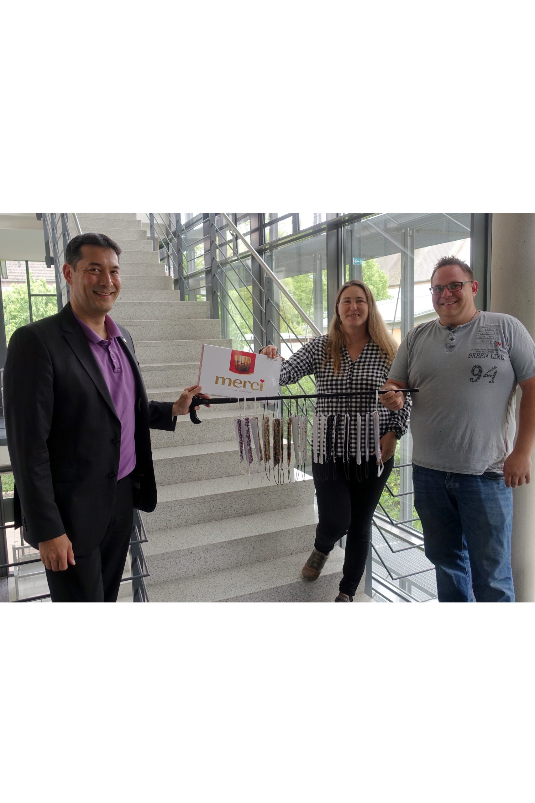 Foto: Gemeinde Denzlingen, v.l.n.r. Bürgermeister Markus Hollemann, Nadine Heizmann und Michael Heizmann von der Narrenzunft Welschkorngeister
