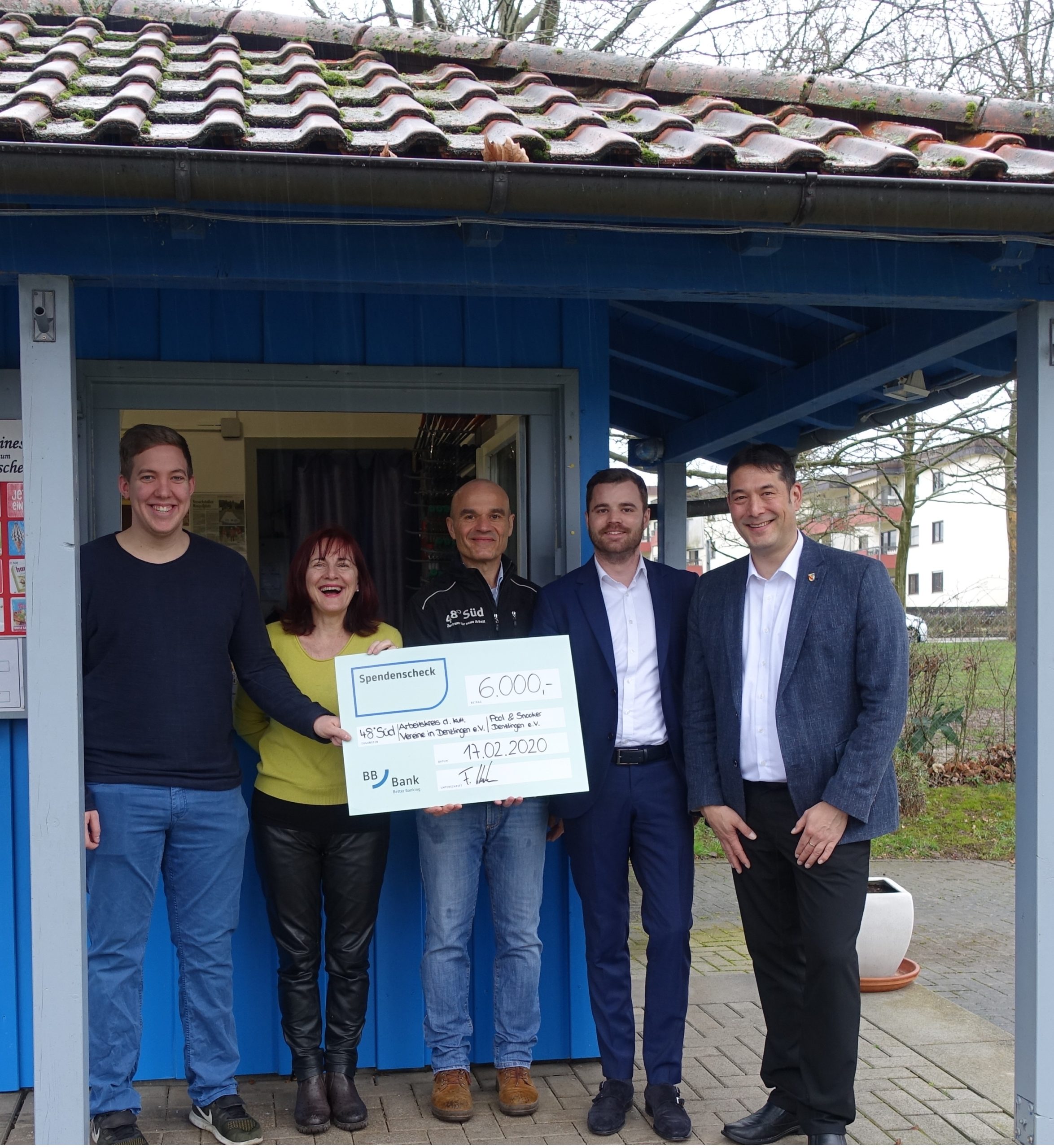 Spendenübergabe BBBank; v.l.n.r. Thomas Hirt (Pool &Snooker Denzlingen e. V.), Petronella Rußer-Grüning (AKVD), Patrick Krezdorn (Geschäftsführer der 48° Süd), Fabian Huber (Filialleiter BBBank), Markus Hollemann (Bürgermeister Gemeinde Denzlingen).