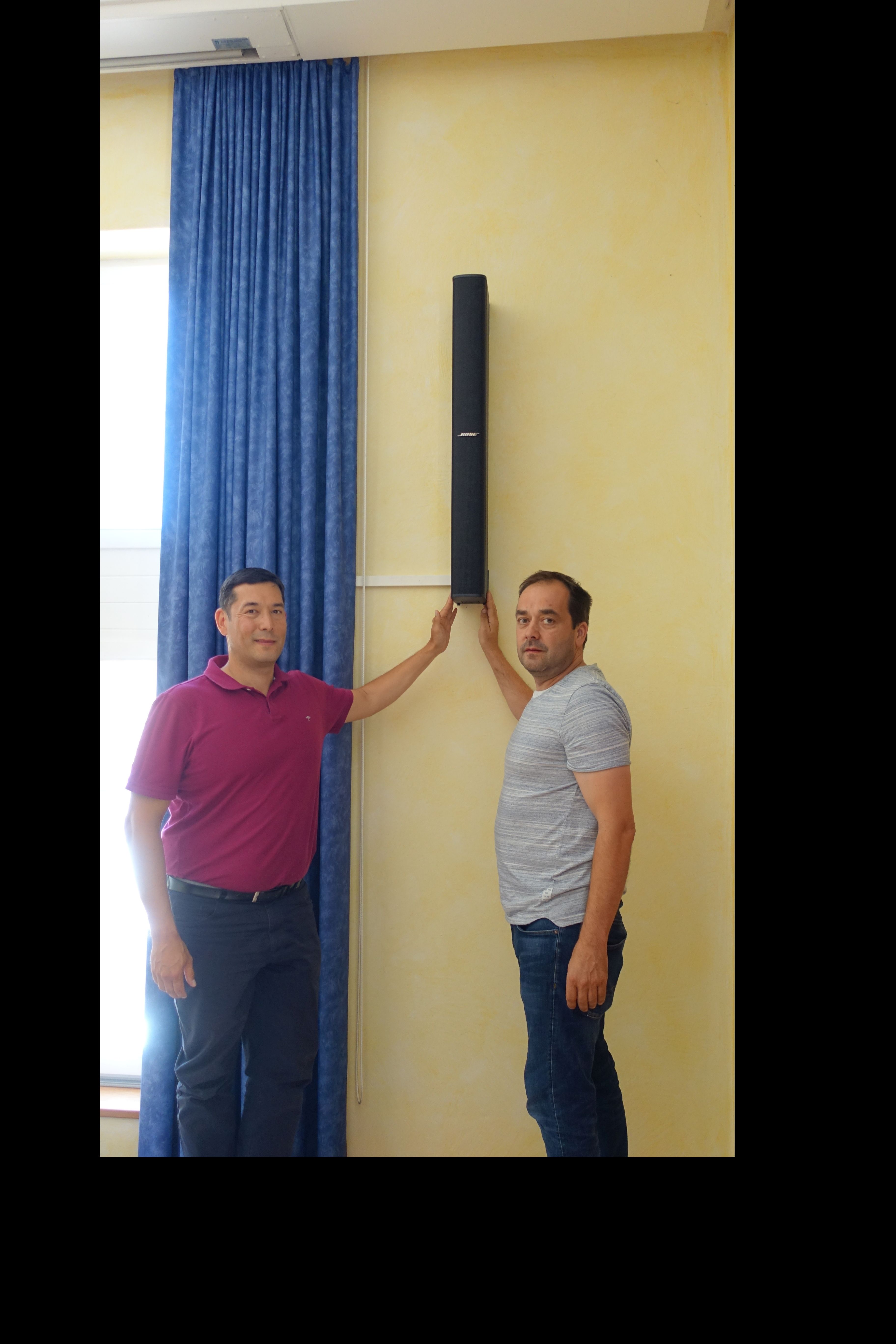 Neue Soundanlage im Ratssaal; vlnr Bürgermeister Markus Hollemann, Roland Hank (Gebäude-, Energiemanagement); Bild: Gemeinde Denzlingen