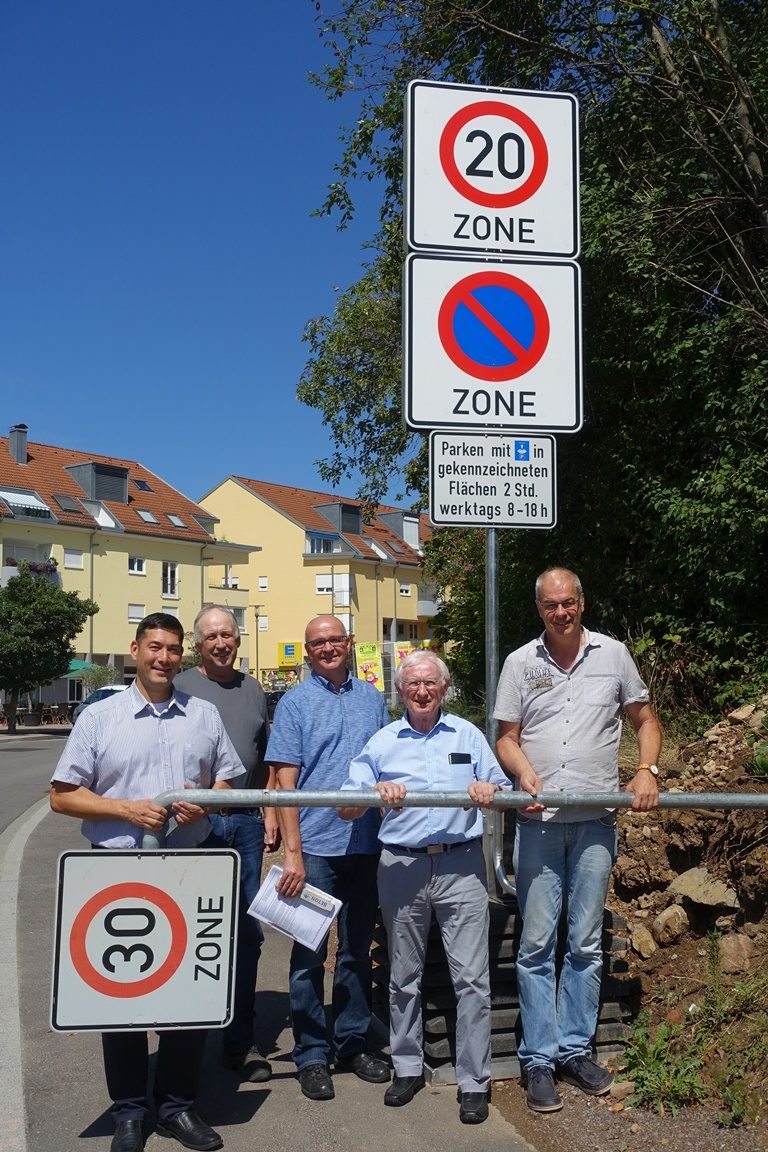 Tempo 20 in der Rosenstraße; Foto (v.l.n.r.): Bürgermeister Markus Hollemann, Bauhofleiter Heinz Jund, Mario Hahn (Abteilung Tiefbau), Prof. Dr. Dieter Geuenich (Gemeinderat), Leiter der Abteilung Tiefbau Hans-Jürgen Schneider.