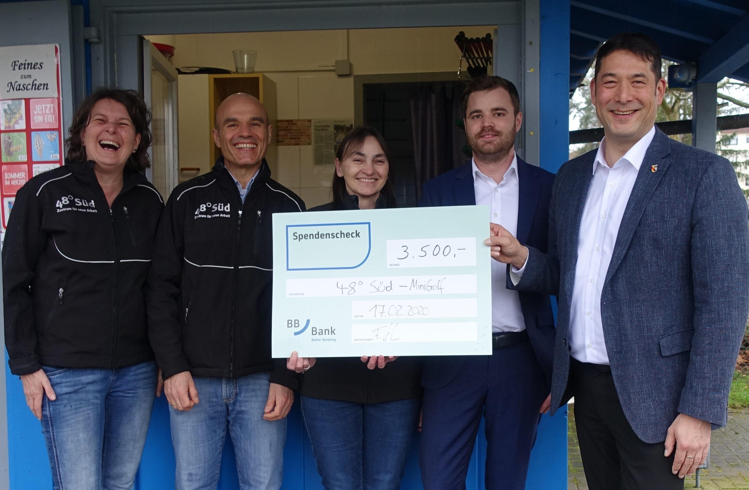Freude bei der Scheckübergabe der BBBank an 48° Süd gGmbH für Sanierungsarbeiten am Denzlinger Minigolfplatz; v.l.n.r. Brigitte Schweizer, Patrick Krezdorn (Geschäftsführer der 48°Süd), Christine Schultis, Fabian Huber (Filialleiter BBBank), Markus Hollemann (Bürgermeister Gemeinde Denzlingen)